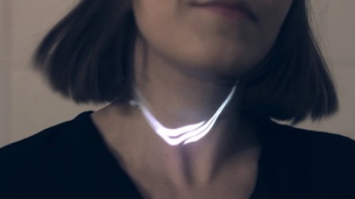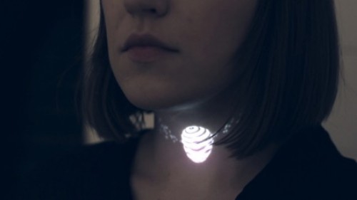 Neclumi是一款十分概念前衛(wèi)的“隱形”項(xiàng)鏈,它依靠一塊佩戴在穿戴者衣領(lǐng)出的小投影儀來(lái)顯示各種圖案樣式,每個(gè)圖案動(dòng)態(tài)變化,甚至可根據(jù)佩戴者的活動(dòng)做出響應(yīng),使用者通過(guò)手機(jī)app來(lái)更換不同主題,在夜晚炫酷之極!