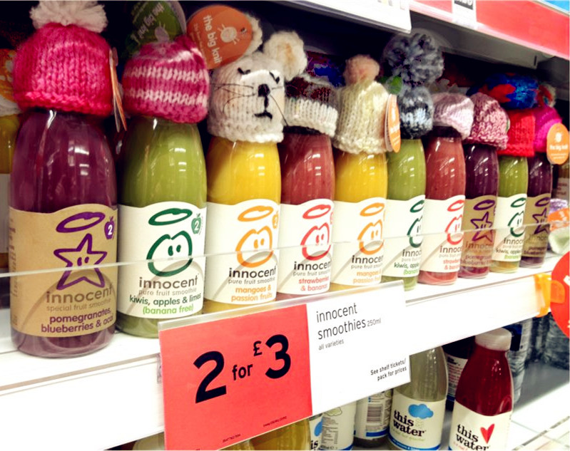 每年11月底,英國Sainsbury’s還有樂購超市里賣的Innocent的果汁的小瓶都會在瓶蓋處戴上小毛線帽,而且每個小毛線帽都是獨一無二的。