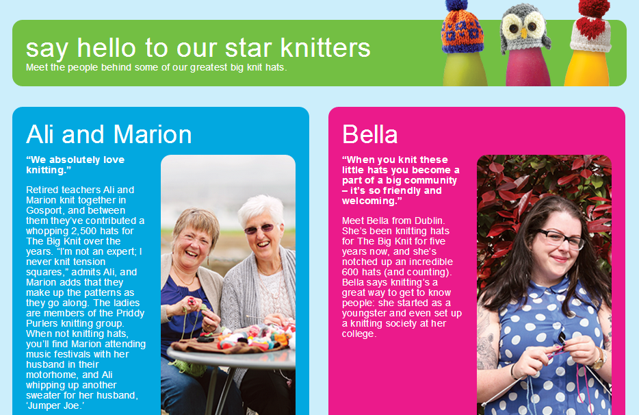 關(guān)于BigKnit BigKnit的歷史已經(jīng)有11年之久,他們是從2003年開始這項活動的。剛剛開始這項活動的時候,他們織了2萬個小帽子,當(dāng)年籌得了一萬英鎊。到2011年,他們一共籌得了100萬鎊。這些錢用于改善當(dāng)?shù)乩先说纳顮顩r,冬天取暖,冬日的熱食,組織老年人的社交活動等。參與編織小帽子的人有年輕人,也有一些老人,Age UK還組織了一個個編織小組。這個編織小組中同時還有一部分是通過BigKnit收到幫助的老人,他們通過給這個活動編織小帽子希望這個活動能夠幫助到更多的老人,希望更多的人能夠收到幫助。