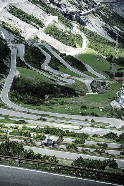 抬頭仰望山頂,陽光正在與覆有積雪的山峰嬉戲, 將它們變成了粉色的巨大冰棍。而我們?nèi)蕴幵谏侥_下,一切被影子籠罩著,好像死亡之谷般寂靜。路面上泛出潮濕的光澤,讓人覺得有一絲夏秋交替時(shí)的涼意,或者 確切說是冷汗——因?yàn)閺澬囊呀?jīng)如此之近,以至于我們根本來不及制動(dòng)。以全速闖入170度的彎角,聽上去就像絕望時(shí)的道別。盡管加速踏板位置在進(jìn)入彎角的那 一剎那始終沒有改變過,但是不可思議的是,車輛卻已順利過彎。此時(shí)焦慮早已煙消云散,不如趁著間隙吃個(gè)三明治吧,因?yàn)樵诘诌_(dá)下一個(gè)彎角前,我們擁有充足的 時(shí)間來好好放松一下。