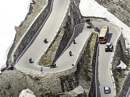 著名的斯泰爾維奧山口(Passo Stelvio)大名如雷貫耳,它不僅是歐洲最著名的山道,同時(shí)也是汽車編輯們用來體驗(yàn)山路試車的不二之選。要想前往斯泰爾維奧,就得先經(jīng)過意大利的小鎮(zhèn) 博爾米奧(Bormio)。如果你沿著山路翻過海拔為2757米的山口,便能到達(dá)奧地利,或者從半山腰的岔道向左行駛,便可進(jìn)入瑞士境內(nèi)。這條曲折壯觀的 山道不僅吸引著駕車者慕名前來,還成為公路騎行愛好者挑戰(zhàn)極限的最佳之處。