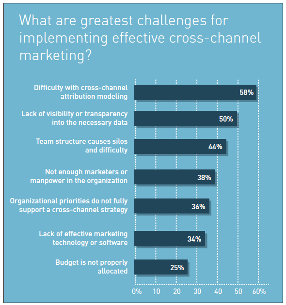 除了歸因分析,50%營銷人員也表示必要數(shù)據(jù)缺少可視性或透明度也是跨渠道營銷的一個挑戰(zhàn)。對那些想要全面了解營銷過程的受訪者來說消費者往往訪問多渠道也是個問題。