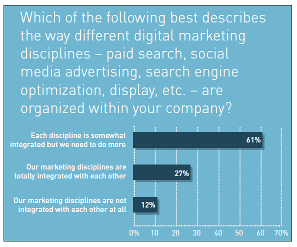 雖然整個產(chǎn)業(yè)都在尋求跨團隊間更多的合作,但是前路漫漫。當問及企業(yè)營銷原則時,不足三分之一的受訪者(27%)表示他們的營銷原則是和其他團隊整合的。