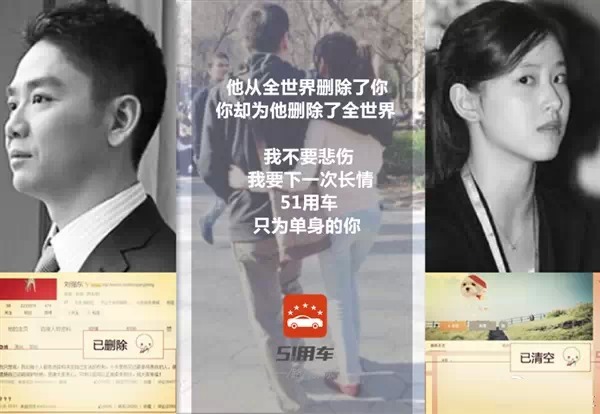 “他從全世界刪除了你,你卻為他刪除全世界,我不要悲傷,我要下一次長情,51用車,只為單身的你”。這是51用車在微博上率先引出的文案,在這之后,網(wǎng)友們及各大電商門戶網(wǎng)站也紛紛效仿,加入了這場惡搞混戰(zhàn)。。。
