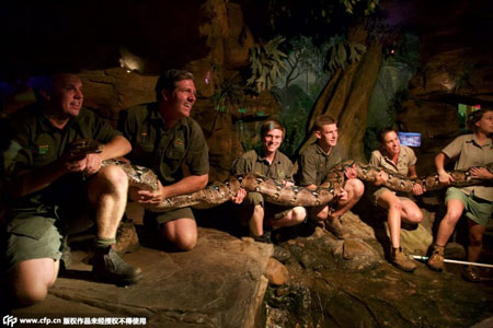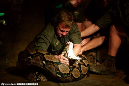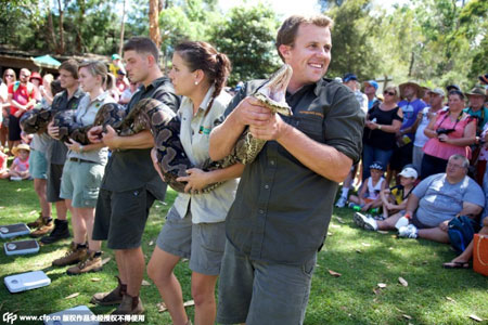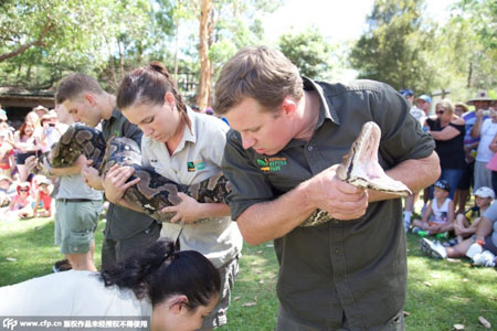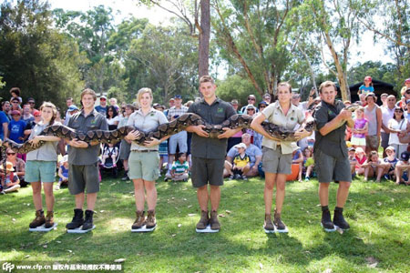 澳大利亞新南威爾士州,爬蟲動(dòng)物公園的大蟒蛇“超級(jí)貝蒂”迎來了一年一度的稱重活動(dòng)。這條6.5米長(zhǎng)的巨蟒今年體重為129公斤,比去年輕了11公斤。今年的貝蒂比往年脾氣更大,在稱重過程中不斷掙扎,但是幸運(yùn)地是,他的6名飼養(yǎng)員最終完成了稱重任務(wù),并無任何事故發(fā)生。