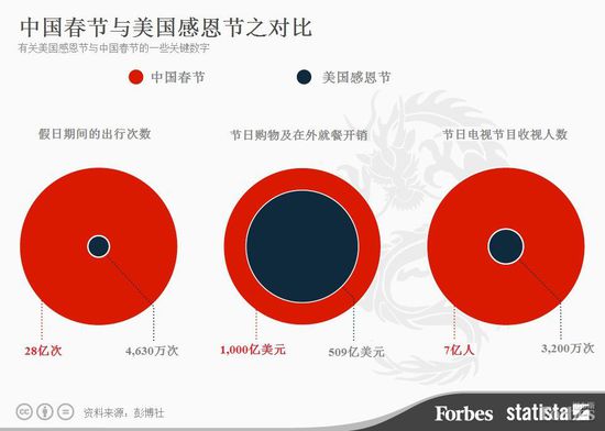 和美國人一樣,中國人也會在節(jié)日期間進(jìn)行瘋狂購物。美國人在感恩節(jié)周末的消費(fèi)數(shù)字令人嘆為觀止,但是中國人在春節(jié)期間的支出是美國人的兩倍——1,000億美元。中國人還喜歡在春節(jié)期間觀看電視。在感恩節(jié)當(dāng)天,約有3,200萬名美國人觀看全美規(guī)模最大的橄欖球賽事,但是中國央視在除夕當(dāng)晚直播的春節(jié)聯(lián)歡晚會收視觀眾還要多,大約在7億至8億人之間!
