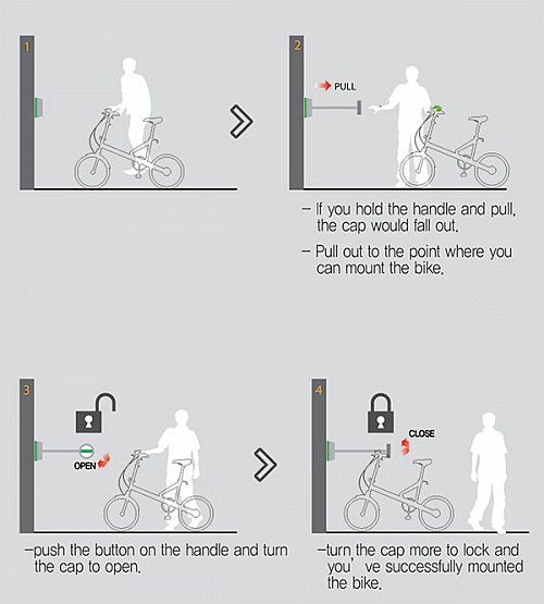 這套嵌入墻內(nèi)的自行車鎖最大限度的減少了地面設(shè)施的使用,充分利用寶貴的公共空間,可靠性和安全性也有所提升,自行車的推進(jìn)推出也十分方便。