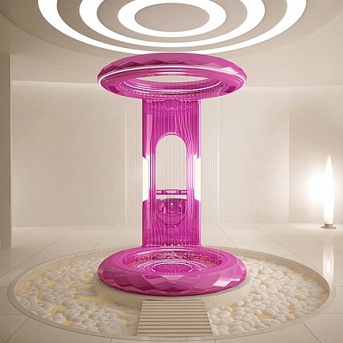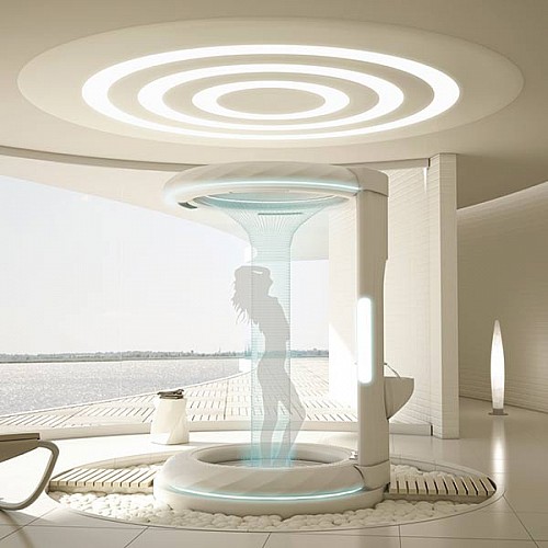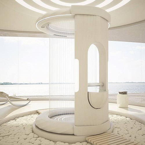 設(shè)計(jì)師Naser和Taher Nasiri提出了新的浴室設(shè)計(jì)理念——去掉墻壁和毛巾。這款浴室在人們眼里就像是《星際迷航》中的運(yùn)輸艙。浴室頂端的小圓環(huán)中裝有淋浴頭,同外部的大型圓環(huán)相結(jié)合,用來(lái)模擬陣雨和洶涌瀑布的水流。浴室在有效半徑內(nèi)都具有設(shè)備齊全的排水設(shè)備,所以它不需要墻壁。用戶還可以通過(guò)小型數(shù)字面板或者是浴室內(nèi)的控制瓣來(lái)調(diào)節(jié)水壓和水溫。整體設(shè)計(jì)還包括具有特色的空氣干燥器,所以你根本不需要毛巾。
