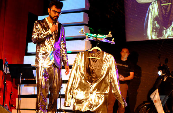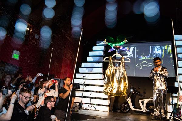 特別有“互聯(lián)網(wǎng)思維”的服飾品牌Betabrand在“硅谷時裝周”再一次上演別出心裁的時裝秀——用無人機代替模特!每當主持人介紹一件產(chǎn)品時,無人機就會載著掛在衣架上的服裝翩然而至,以下取自美國網(wǎng)站視頻的現(xiàn)場圖片。
