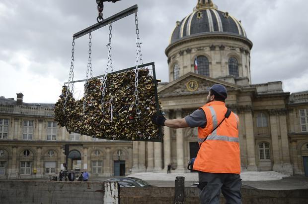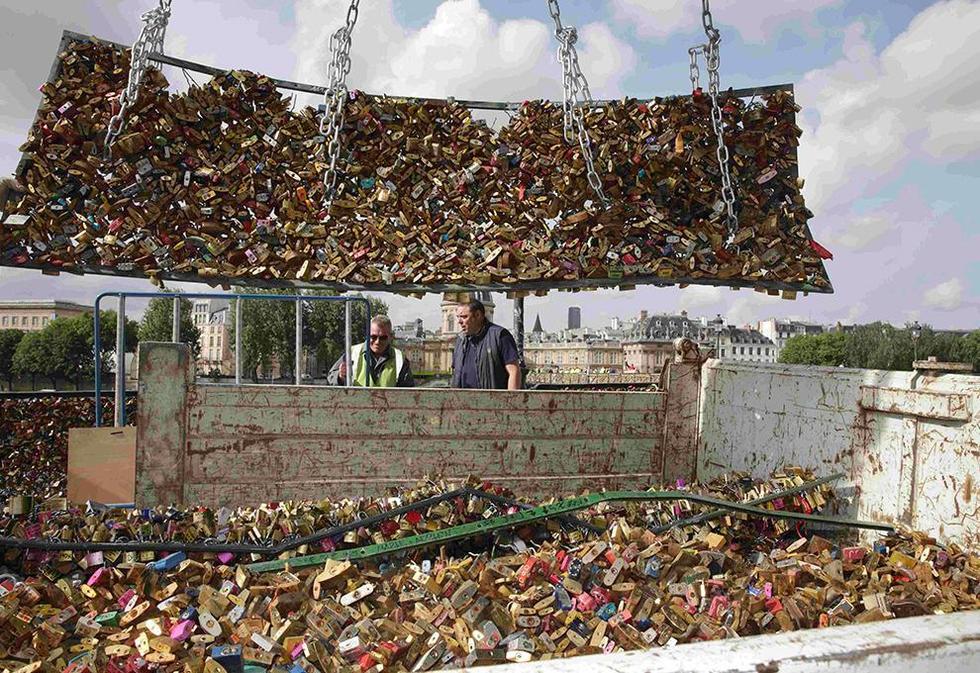 巴黎是浪漫之都,而塞納河上的藝術(shù)橋(Pont des Arts)更是來自世界各地的情侶們喜歡掛象征愛情長久的“同心鎖”的圣地。但從2008年至今,藝術(shù)橋上已經(jīng)掛滿了數(shù)十萬的同心鎖,大橋已不堪重負(fù),當(dāng)?shù)厝思娂姾粲酢罢取边@座百年老橋。最近,巴黎市政府決定從6月1日到6月8日,封閉大橋,開始拆除這些愛情鎖。(獨(dú)家新聞編譯,未經(jīng)授權(quán),不得轉(zhuǎn)載。)