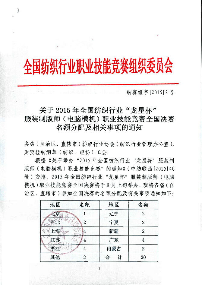 關(guān)于2015年全國紡織行業(yè)“龍星杯”服裝制版師(電腦橫機(jī))職業(yè)技能競賽全國決賽分配名額及相關(guān)事項(xiàng)的通知