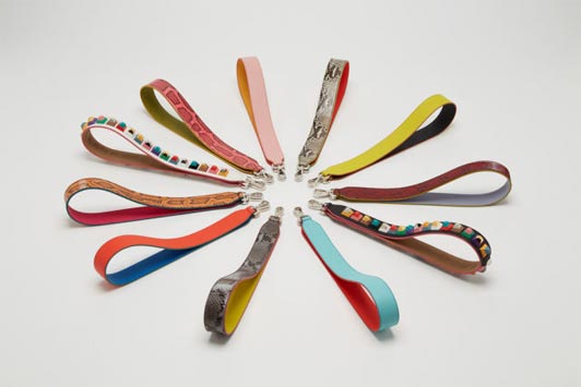 這個系列一共9件,全部是可以用在FENDI包袋上的個性化肩帶,雙面色彩,部分使用了蟒蛇皮制作,有兩條還釘上了與新款包包同類型的彩色方塊。每一條肩帶兩頭都安裝有兩個用金或銀為原材料打造的環(huán)扣。