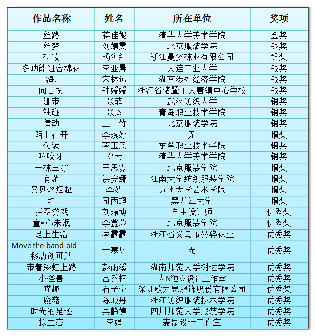 經(jīng)過主辦方組織國內(nèi)外著名服裝設(shè)計(jì)大師、權(quán)威服裝評論家、服裝及時(shí)尚界權(quán)威人士等組成的專家評審團(tuán)進(jìn)行緊鑼密鼓的評選,通過層層篩選,最后評選出金獎(jiǎng)1名、銀獎(jiǎng)5名,銅獎(jiǎng)及優(yōu)秀獎(jiǎng)各10名,并對獲獎(jiǎng)作品進(jìn)行了動(dòng)態(tài)展示。經(jīng)過高規(guī)格評選出的作品,引領(lǐng)襪業(yè)流行趨勢,受到在場業(yè)內(nèi)人士的一致認(rèn)可。