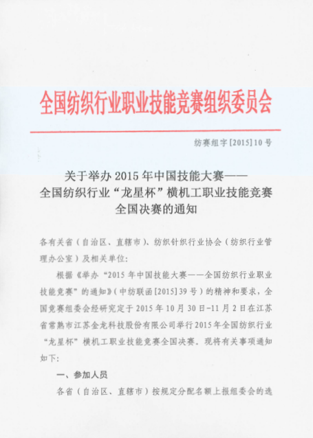 關(guān)于舉辦2015年中國(guó)技能大賽——全國(guó)紡織行業(yè)“龍星杯”橫機(jī)工職業(yè)技能競(jìng)賽全國(guó)決賽的通知