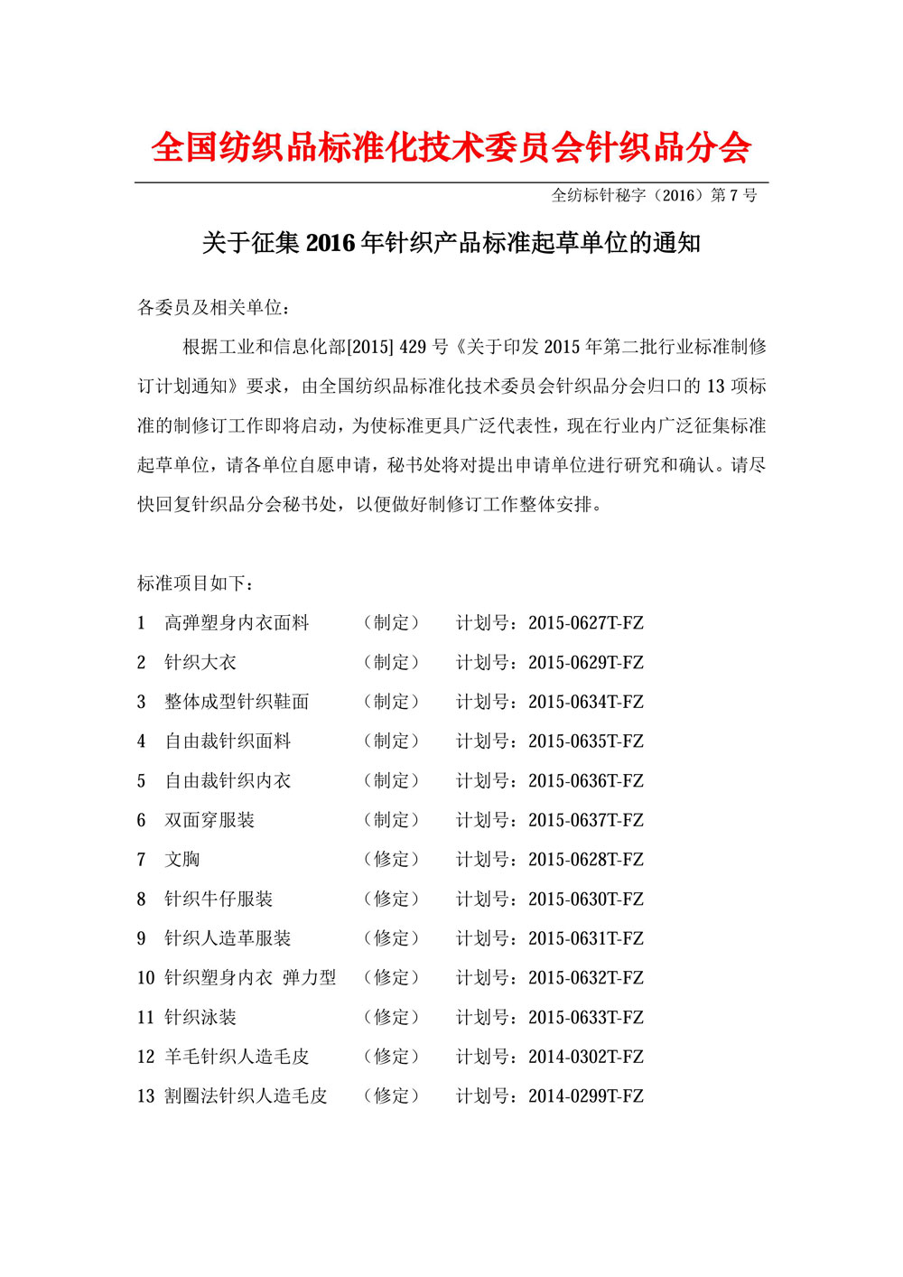 2016征集針織產(chǎn)品標(biāo)準(zhǔn)起草單位的通知