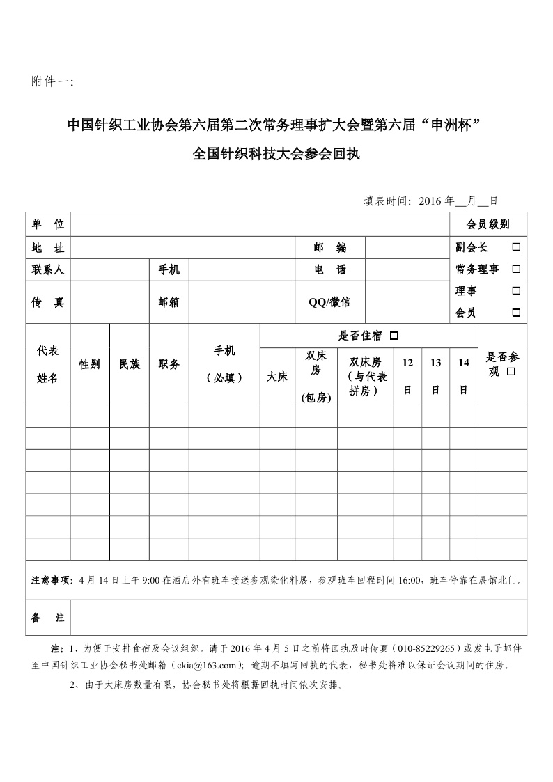 附件一:中國(guó)針織工業(yè)協(xié)會(huì)第六屆第二次常務(wù)理事擴(kuò)大會(huì)暨第六屆“申洲杯”全國(guó)針織科技大會(huì)參會(huì)回執(zhí)