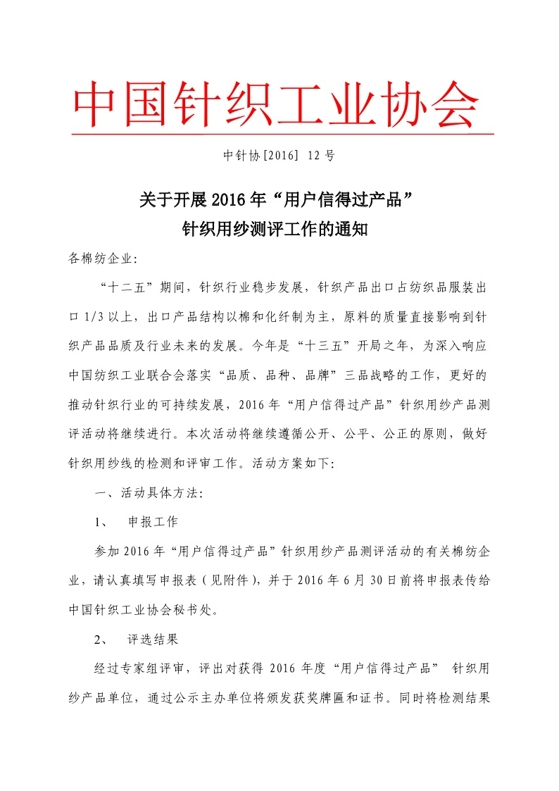 "用戶信得過產(chǎn)品"針織用紗測評工作通知
