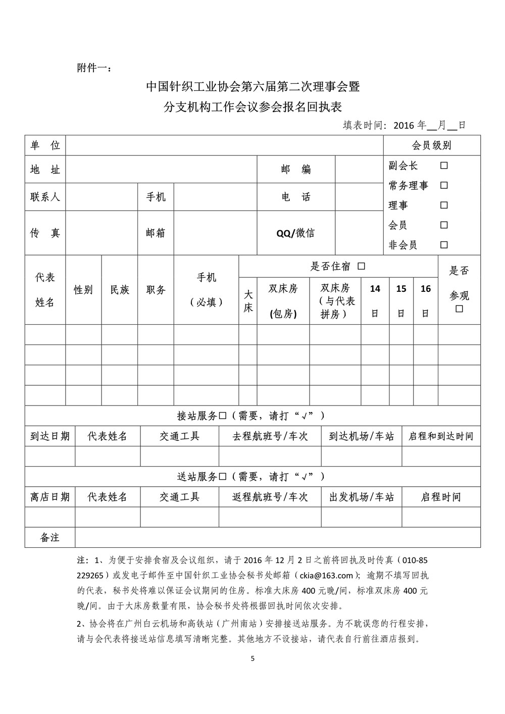 中國針織工業(yè)協(xié)會第六屆第二次理事會暨分支機構(gòu)工作會議報名回執(zhí)表