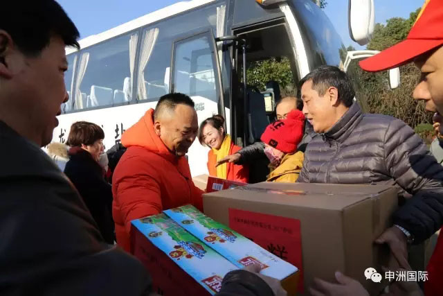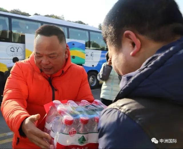 馬董事長向返鄉(xiāng)員工分發(fā)路上吃的蛋糕、飲用水,親切地向員工問好:“順順利利回家過年,高高興興再回來!”