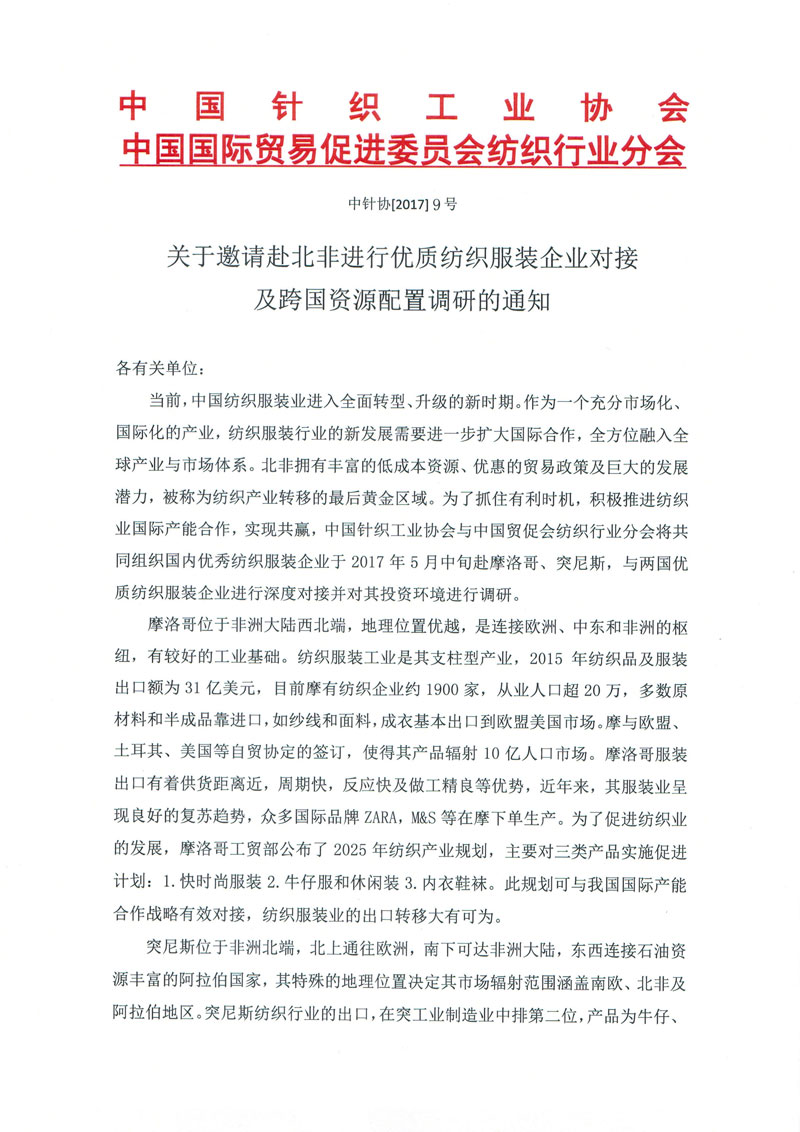 關于邀請北非進行優(yōu)質紡織服裝企業(yè)對接及跨國資源配置調研的通知
