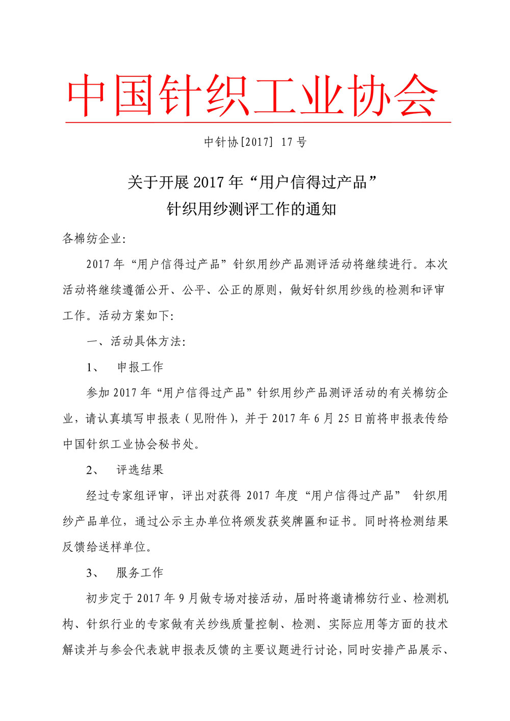 2017“用戶信得過產(chǎn)品”針織用紗測評(píng)工作通知