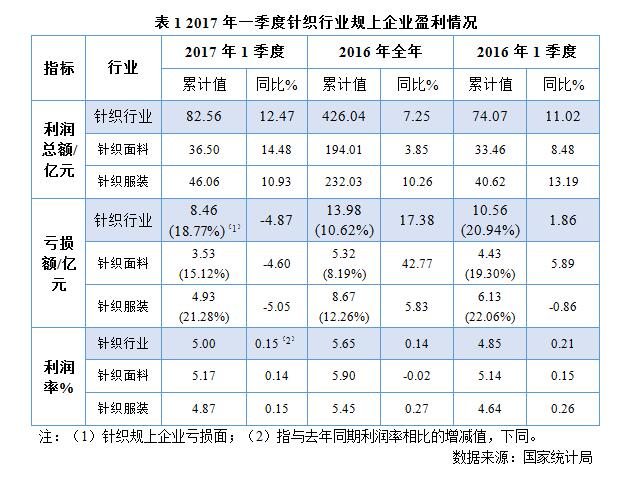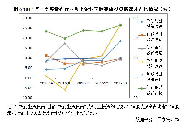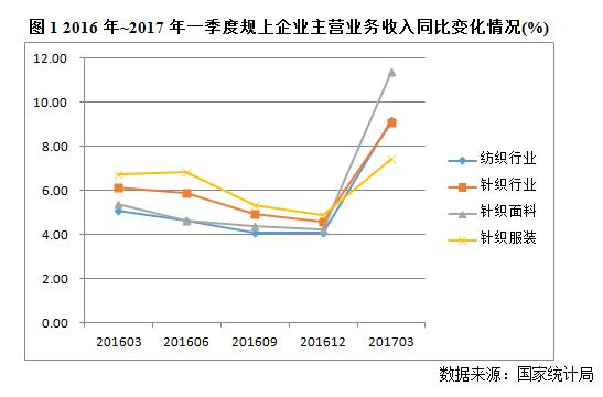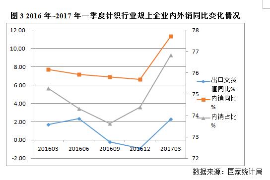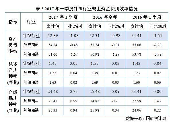 2017年一季度,針織行業(yè)規(guī)上企業(yè)運行態(tài)勢良好,企業(yè)產銷流動性提高;內銷增長帶動行業(yè)市場和產品結構調整;行業(yè)盈利狀態(tài)改善,資金使用狀態(tài)良好,但成本費用繼續(xù)提升;同時,行業(yè)投資加快,特別是針織服裝投資的觸底反彈,帶動行業(yè)投資快速增長。