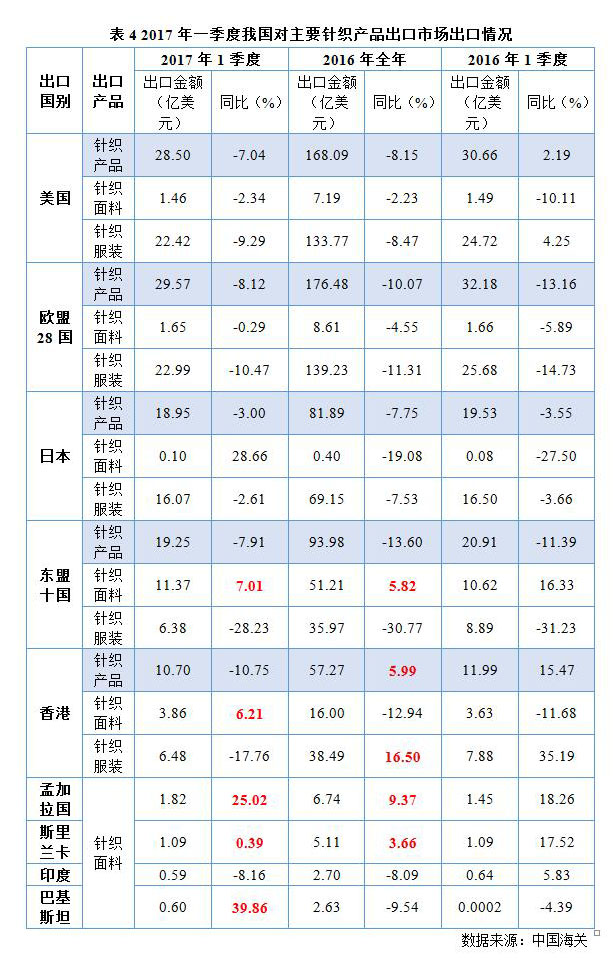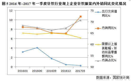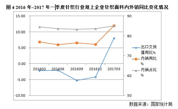 2017年一季度針織行業(yè)內銷市場領先海外市場回暖,行業(yè)投資增速加快,國內經濟企穩(wěn)跡象明顯,加之國內消費升級作用進一步顯現,內銷對行業(yè)發(fā)展的拉動作用越發(fā)重要。一季度海外市場依然沒有較大改觀,我國對歐美日等國出口持續(xù)下行,但針織面料對東盟、孟加拉國、斯里蘭卡和巴基斯坦等國家出口明顯提速,針織服裝產能轉移現象明顯。