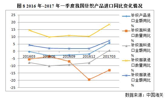 2017年一季度針織產品進口9.41億美元(2016年全年進口41.58億美元),同比增長5.79%,較去年同期增速提高6.09個百分點。具體的,2016年~2017年一季度針織服裝進口一直維持增長,今年一季度針織服裝進口量價齊升,一季度進口5.78億美元(2016年全年進口21.26億美元),同比增長7.38%,增速較去年同期提高2.91個百分點,進口數量同比大增18.67%,國內消費升級為針織服裝進口增長帶來動力;針織面料一季度進口與去年同期基本持平,進口3.61億美元(2016年全年進口17.01億美元),國產針織面料的替代作用得到充分顯現。