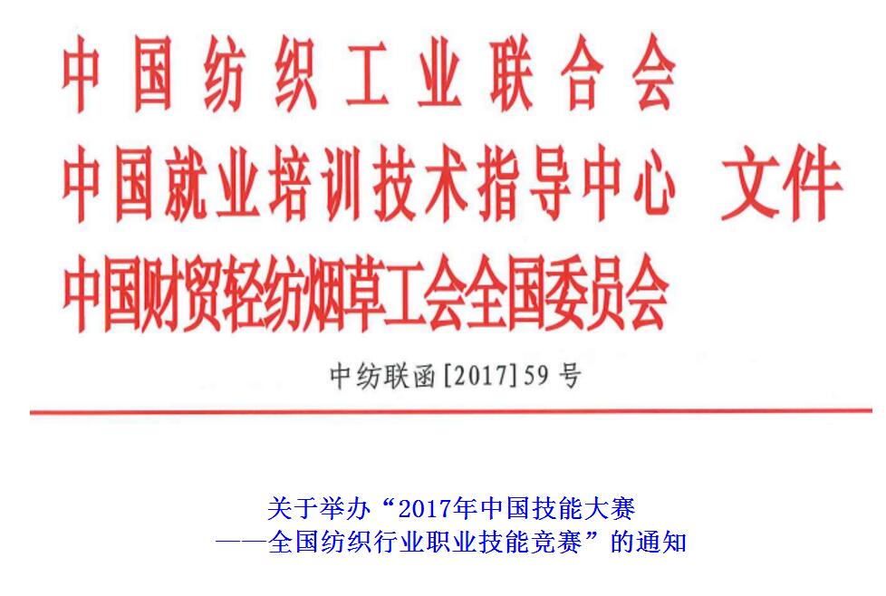 為深入貫徹黨的十八大和十八屆三中、四中、五中、六中全會精神,落實《國家中長期人才發(fā)展規(guī)劃綱要(2010-2020年)》和《中國制造2025》,加快培養(yǎng)和選拔高技能人才,推動我國高技能人才隊伍建設,根據(jù)《人力資源社會保障部關于組織開展2017年中國技能大賽的通知》(人社部函〔2017〕46號)要求,以下簡稱《人社部2017年技能大賽通知》,中國紡織工業(yè)聯(lián)合會與中國就業(yè)培訓技術指導中心、中國財貿輕紡煙草工會決定共同舉辦“2017年中國技能大賽——全國紡織行業(yè)職業(yè)技能競賽”活動,現(xiàn)將有關事項通知如下: