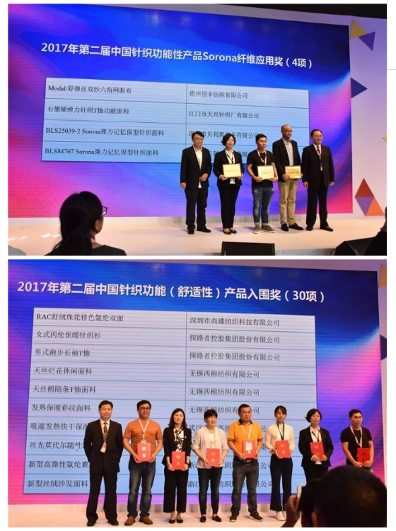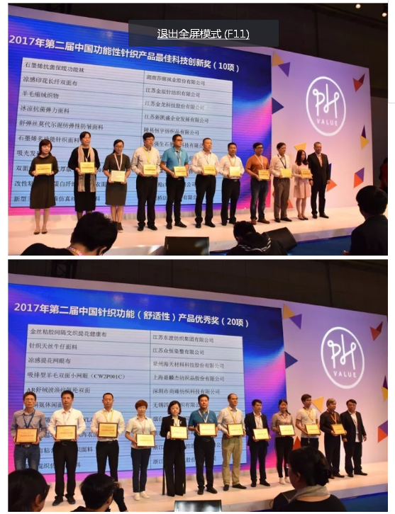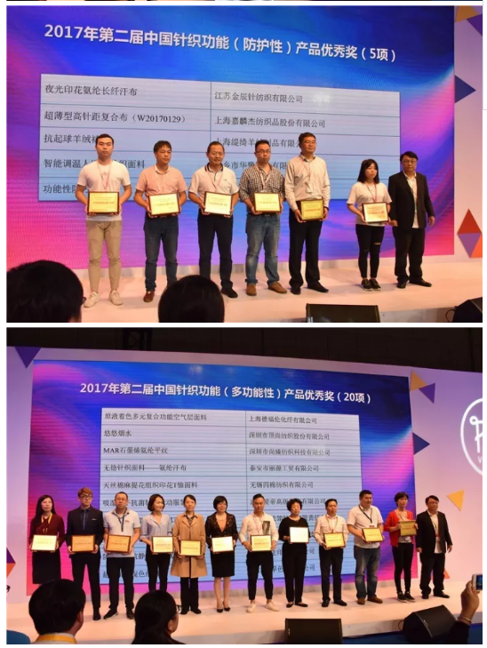 近些年,科技的進步、創(chuàng)意的跨界應(yīng)用、全球資源的流動均為新技術(shù)的推廣、新產(chǎn)品的開發(fā)提供了沃土,一大批代表行業(yè)技術(shù)創(chuàng)新和產(chǎn)品開發(fā)實力的優(yōu)秀企業(yè)在這個過程中脫穎而出。展會當(dāng)天,備受業(yè)界矚目的第二屆中國功能性針織產(chǎn)品評選活動圓滿落幕,最佳科技創(chuàng)新獎10項、最佳市場應(yīng)用獎10項;單項獎——舒適性產(chǎn)品優(yōu)秀獎20項、保健性產(chǎn)品優(yōu)秀獎5項,防護性產(chǎn)品優(yōu)秀獎5項、多功能性產(chǎn)品優(yōu)秀獎20項;Sorona纖維應(yīng)用獎4項以及入圍獎91項悉數(shù)頒出,花落各家。