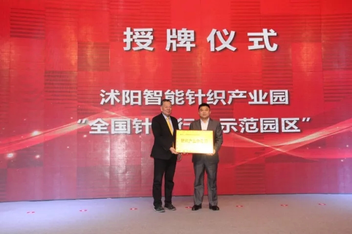 大會(huì)最后,林光興宣讀了關(guān)于授予沭陽智能針織產(chǎn)業(yè)園“全國針織行業(yè)示范園區(qū)”的表彰決定。楊紀(jì)朝向沭陽經(jīng)開區(qū)投資促進(jìn)局局長、沭陽智能針織產(chǎn)業(yè)園管委會(huì)主任魏偉授“全國針織行業(yè)示范園區(qū)”牌!
