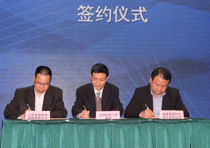 中國(guó)針織工業(yè)協(xié)會(huì)副會(huì)長(zhǎng)林光興與江蘇金龍科技股份有限公司、福建睿能科技股份有限公司代表共同簽約