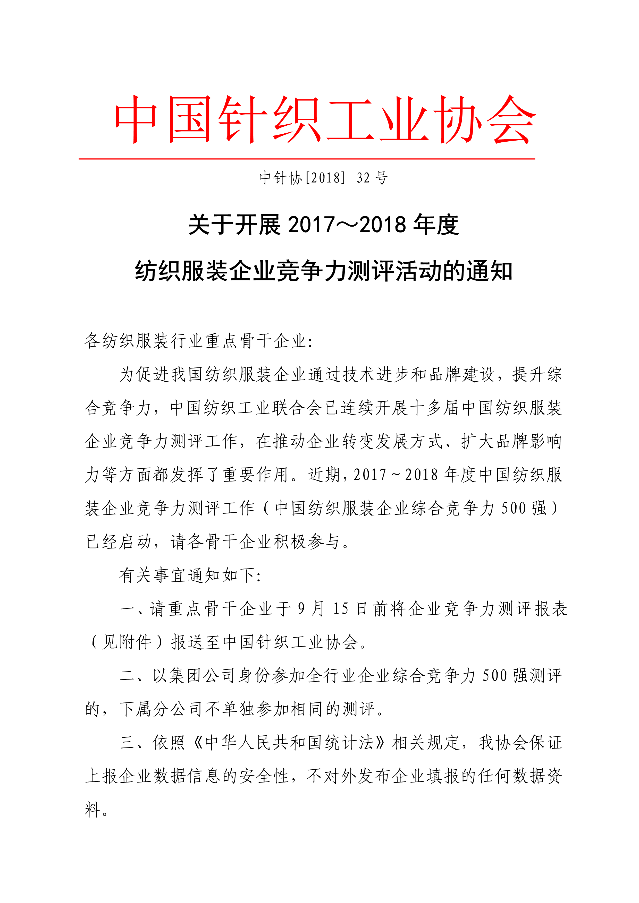 關(guān)于開展2017~2018年度紡織服裝企業(yè)競(jìng)爭(zhēng)力測(cè)評(píng)活動(dòng)的通知