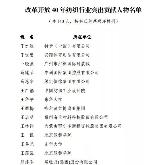 熱烈祝賀申洲國際集團控股有限公司馬建榮、泉州海天新材料科技股份有限公司王啟明、上海三槍(集團)有限公司蘇壽南、安莉芳(中國)服裝有限公司鄭敏泰、江蘇東渡紡織集團有限公司徐衛(wèi)民、濟南元首集團有限公司溫增利、山東康平納集團有限公司陳隊范、北京愛慕股份有限公司張榮明、常州市宏發(fā)縱橫新材料科技股份有限公司談良春、浙江中紡經(jīng)編研究院沈順年、浙江大唐襪業(yè)城有限公司侯志平、東華大學(xué)陳南梁、江南大學(xué)宗平生、天津工業(yè)大學(xué)邱冠雄、江南大學(xué)蔣高明等獲評“改革開放40年紡織行業(yè)突出貢獻人物”。