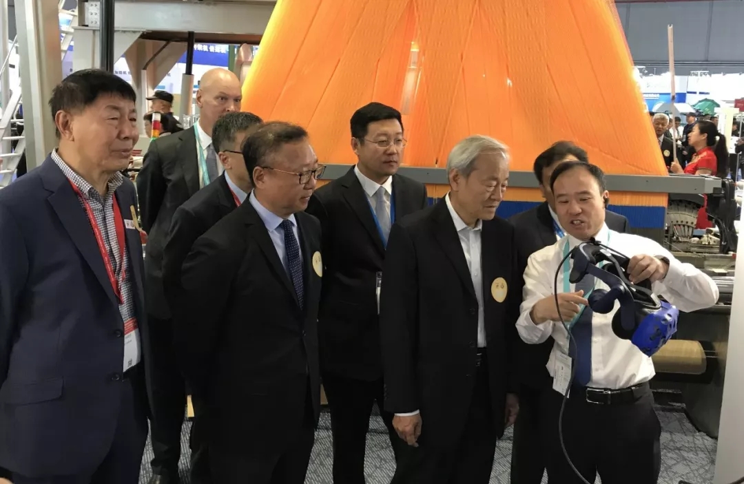 在織造館,孫瑞哲來到范德威爾(中國)紡織機械有限公司、廣州金德紡織機械有限公司、青島天一集團紅旗紡織機械有限公司、圣東尼(上海)針織機器有限公司、意達、必佳樂、史陶比爾、常熟紡織機械廠有限公司等企業(yè)的展位前,了解展品的技術(shù)特點、產(chǎn)品銷售情況和未來的創(chuàng)新趨勢。孫瑞哲對高速、智能化,以及綠色環(huán)保的紡織機械產(chǎn)品予以高度評價。特別是范德威爾人造絲擠出系統(tǒng)用VR演示過程中呈現(xiàn)的令人如同置身于生產(chǎn)車間參觀到整個生產(chǎn)流程的現(xiàn)場感受;意達對劍桿織機進行的改進能幫助客戶節(jié)省開支,產(chǎn)品完全做到在意大利和中國生產(chǎn)品質(zhì)一致;必佳樂的高檔劍桿織機效率極大提升。