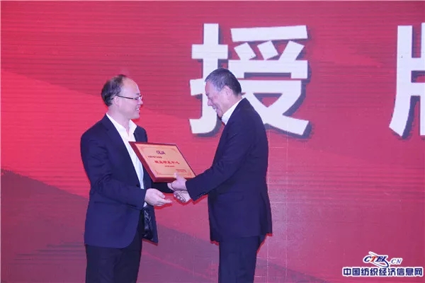 中國紡織工業(yè)聯(lián)合會副會長、中國針織工業(yè)協(xié)會會長楊紀朝為諸暨市大唐鎮(zhèn)黨委書記田海斌授牌——中國針織工業(yè)協(xié)會襪業(yè)研發(fā)中心