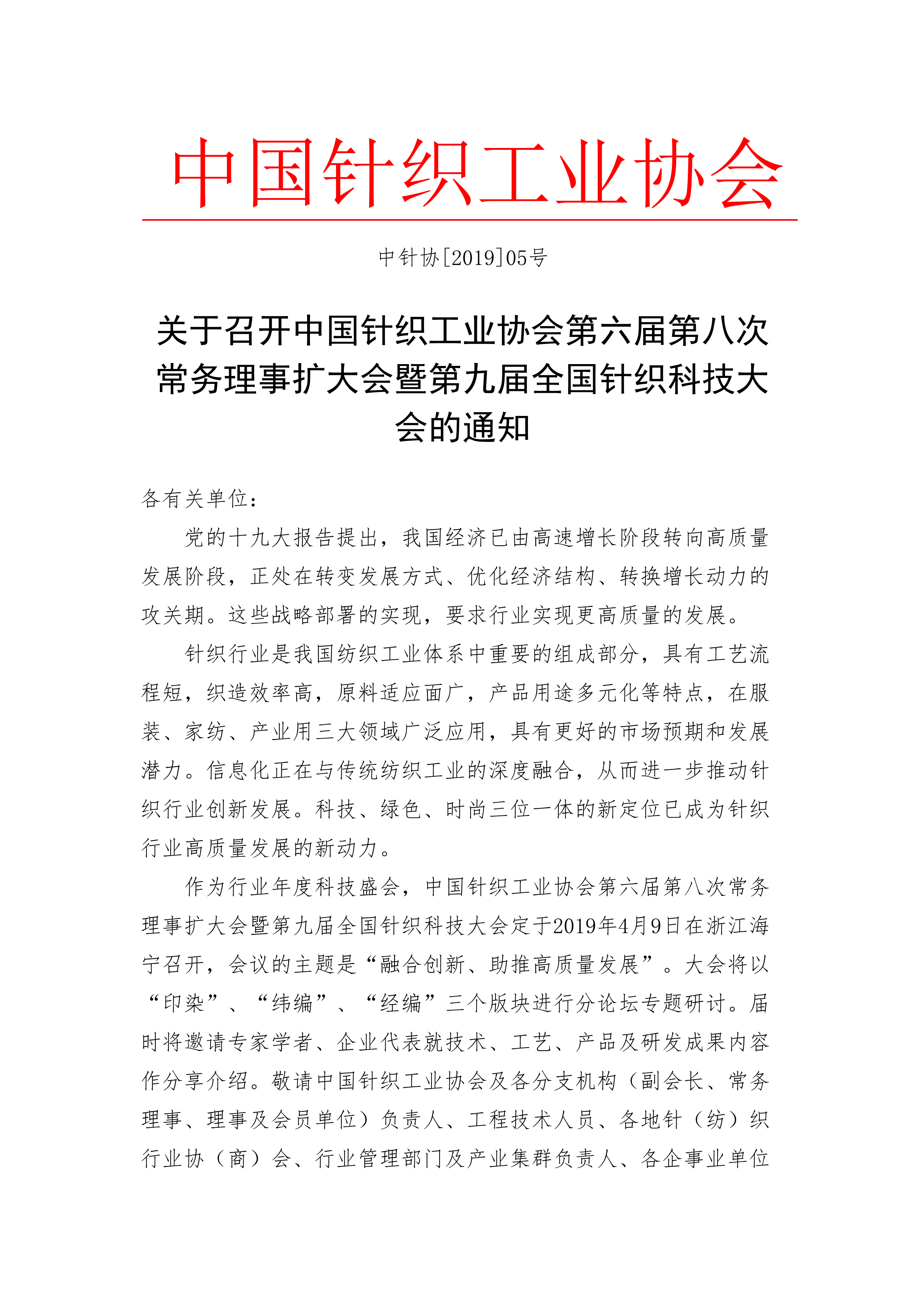 關(guān)于召開中國針織工業(yè)協(xié)會(huì)第八次會(huì)員大會(huì)、第八屆第一次理事會(huì)的通知