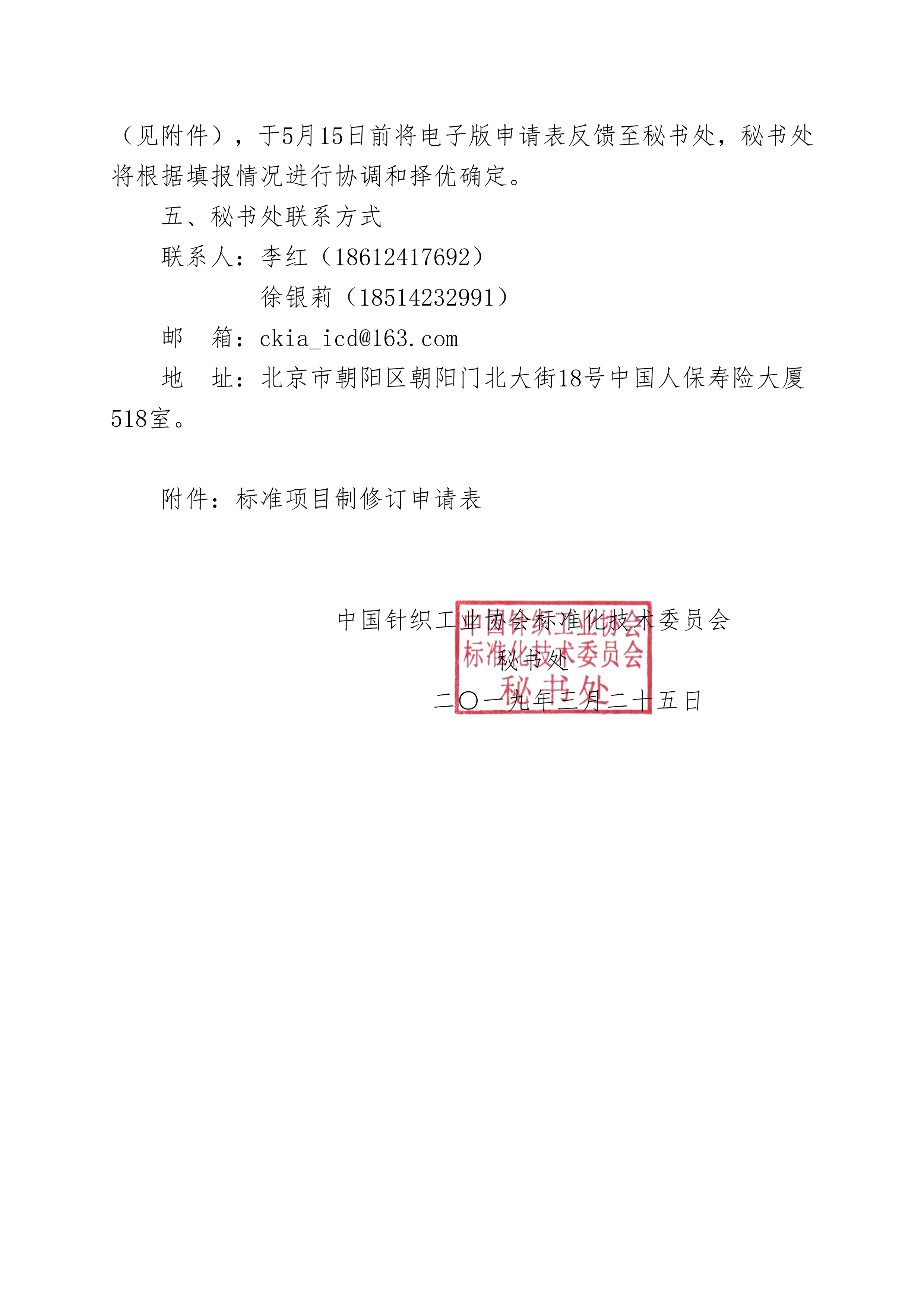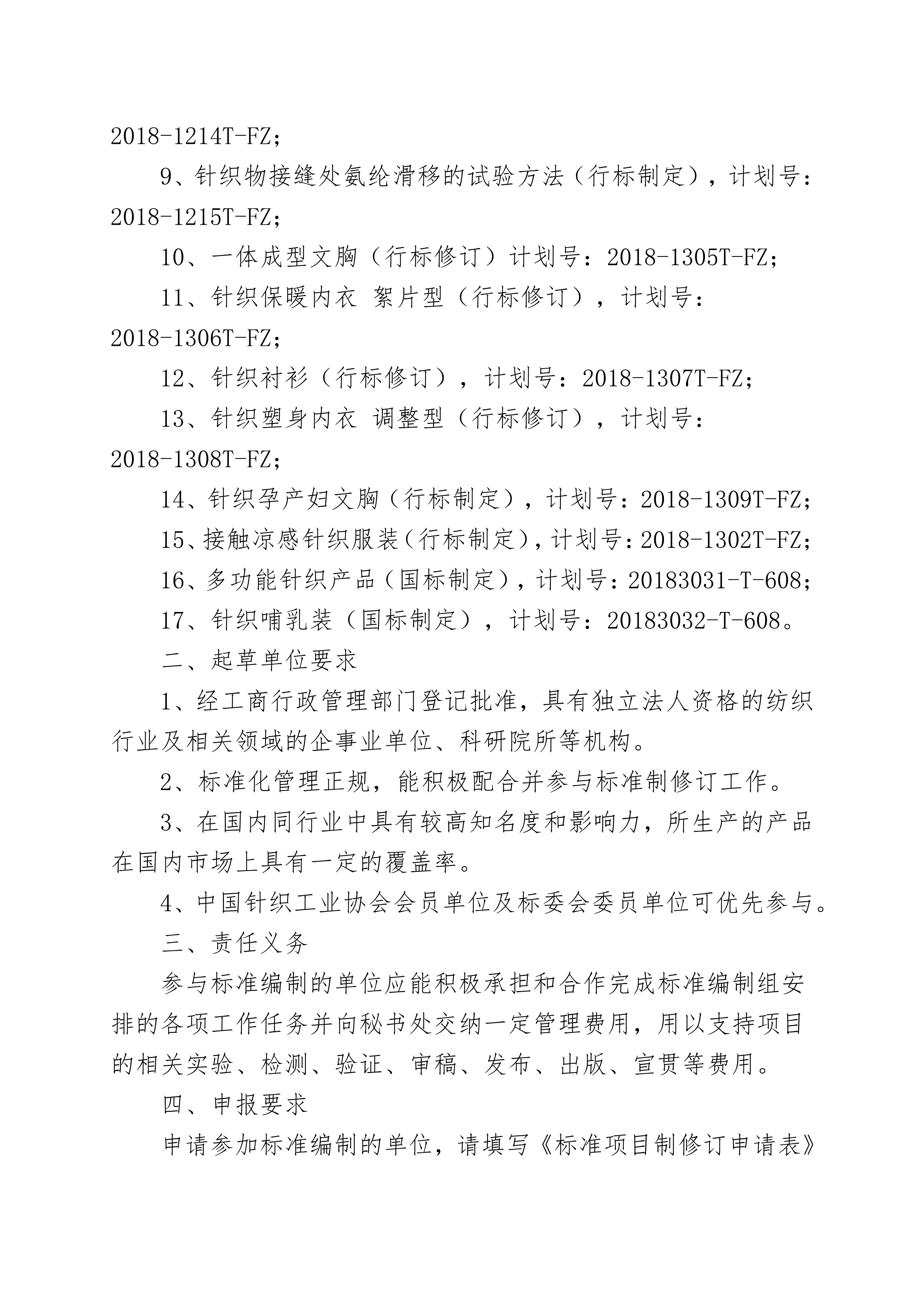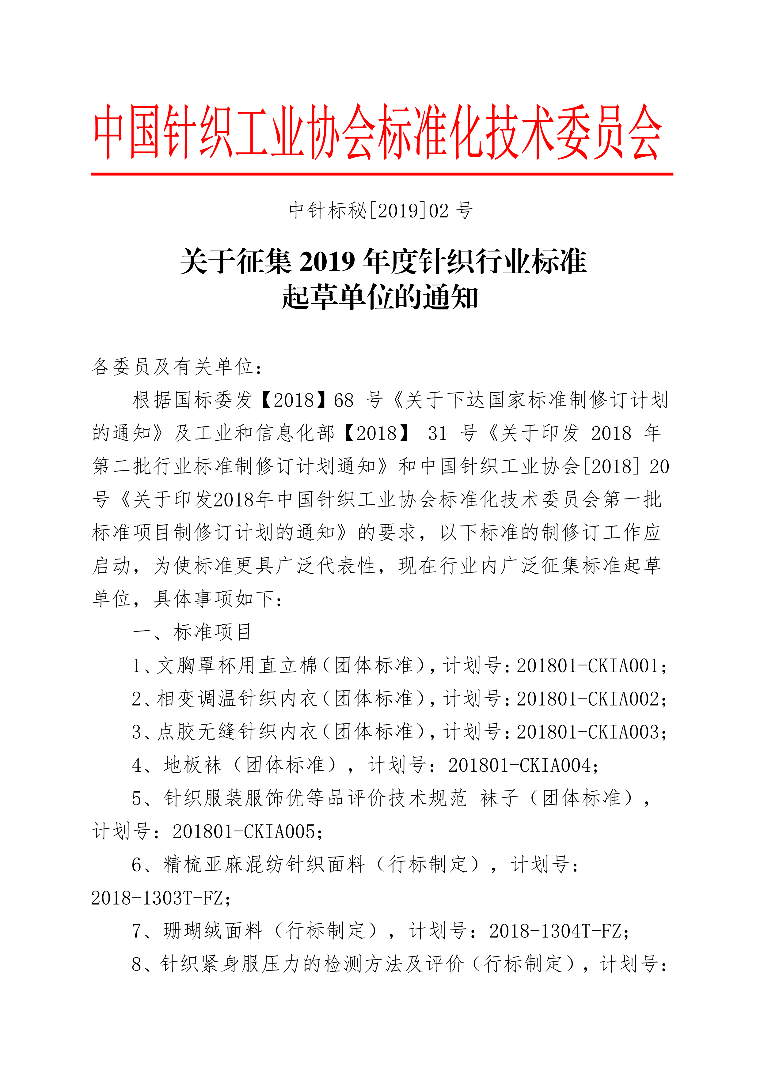 關(guān)于征集2019年針織行業(yè)標(biāo)準(zhǔn)起草單位的通知