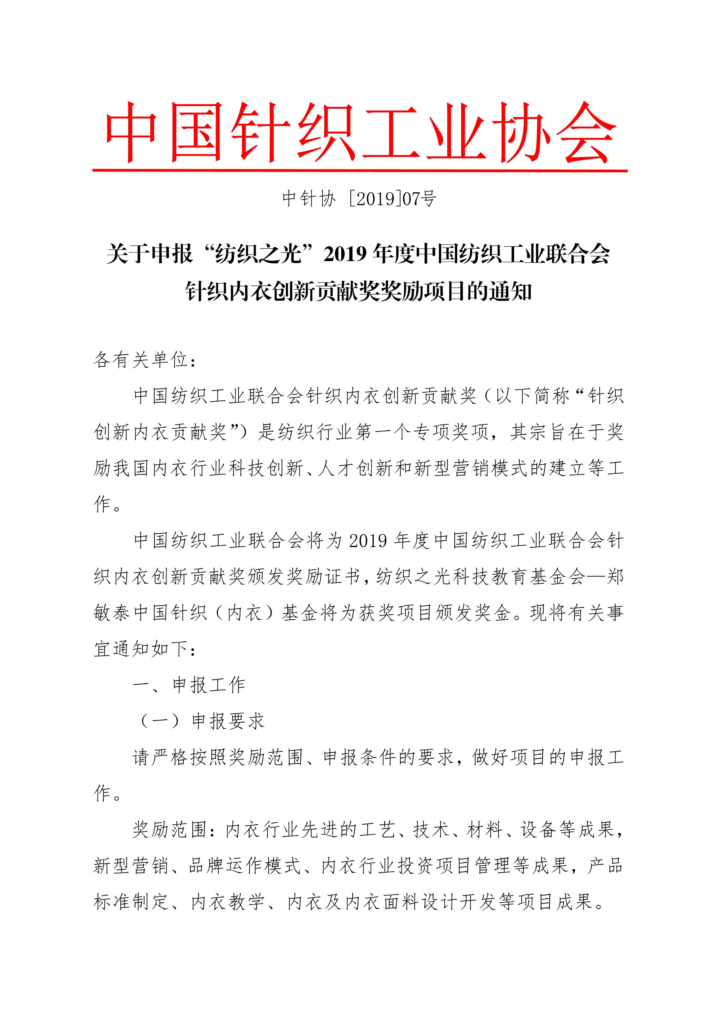 申報(bào)“紡織之光”2019中紡聯(lián)針織內(nèi)衣創(chuàng)新貢獻(xiàn)獎(jiǎng)獎(jiǎng)勵(lì)項(xiàng)目通知