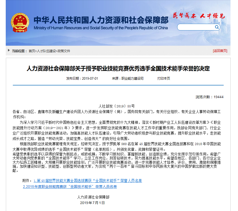人社部日前決定,授予羅凱等560名在第45屆世界技能大賽全國選拔賽和在2018年中國技能大賽中取得優(yōu)異成績的選手“全國技術(shù)能手”榮譽(yù),并頒發(fā)獎?wù)隆ⅹ勁坪蜆s譽(yù)證書。