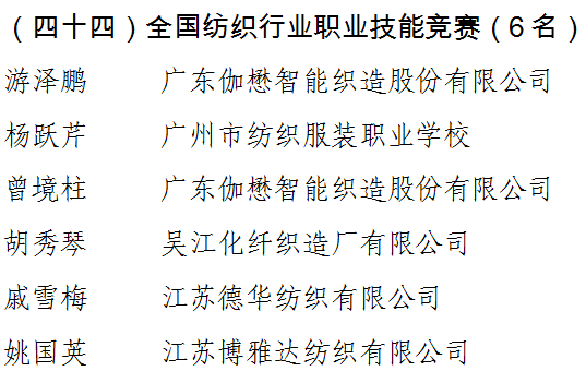 2018年度職業(yè)技能競賽獲“全國技術(shù)能手”榮譽(yù)人員的名單中,紡織行業(yè)有6位優(yōu)秀選手獲得表彰(針織橫機(jī)工和長絲織布工)。