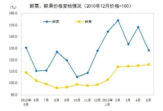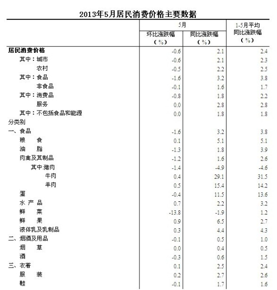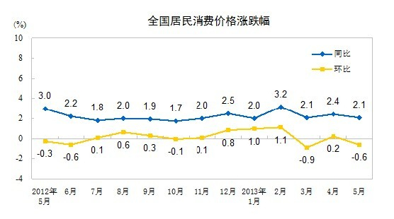 2013年5月份,全國居民消費價格總水平同比上漲2.1%。其中,城市上漲2.1%,農(nóng)村上漲2.2%;食品價格上漲3.2%,非食品價格上漲1.6%;消費品價格上漲1.8%,服務(wù)價格上漲2.8%。1-5月平均,全國居民消費價格總水平比去年同期上漲2.4%。