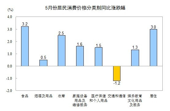 一、各類商品及服務(wù)價格同比變動情況 5月份,食品價格同比上漲3.2%,影響居民消費價格總水平同比上漲約1.05個百分點。其中,糧食價格上漲5.1%,影響居民消費價格總水平上漲約0.15個百分點;鮮果價格上漲6.5%,影響居民消費價格總水平上漲約0.14個百分點;肉禽及其制品價格上漲1.6%,影響居民消費價格總水平上漲約0.12個百分點(豬肉價格下降4.9%,影響居民消費價格總水平下降約0.15個百分點);蛋價格上漲11.5%,影響居民消費價格總水平上漲約0.08個百分點;水產(chǎn)品價格上漲2.2%,影響居民消費價格總水平上漲約0.06個百分點。鮮菜價格下降1.9%,影響居民消費價格總水平下降約0.06個百分點。