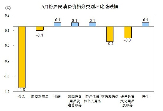 5月份,全國居民消費價格總水平環(huán)比下降0.6%。其中,城市下降0.6%,農(nóng)村下降0.5%;食品價格下降1.6%,非食品價格下降0.1%;消費品價格下降0.8%,服務(wù)價格持平(漲跌幅度為0,下同)。