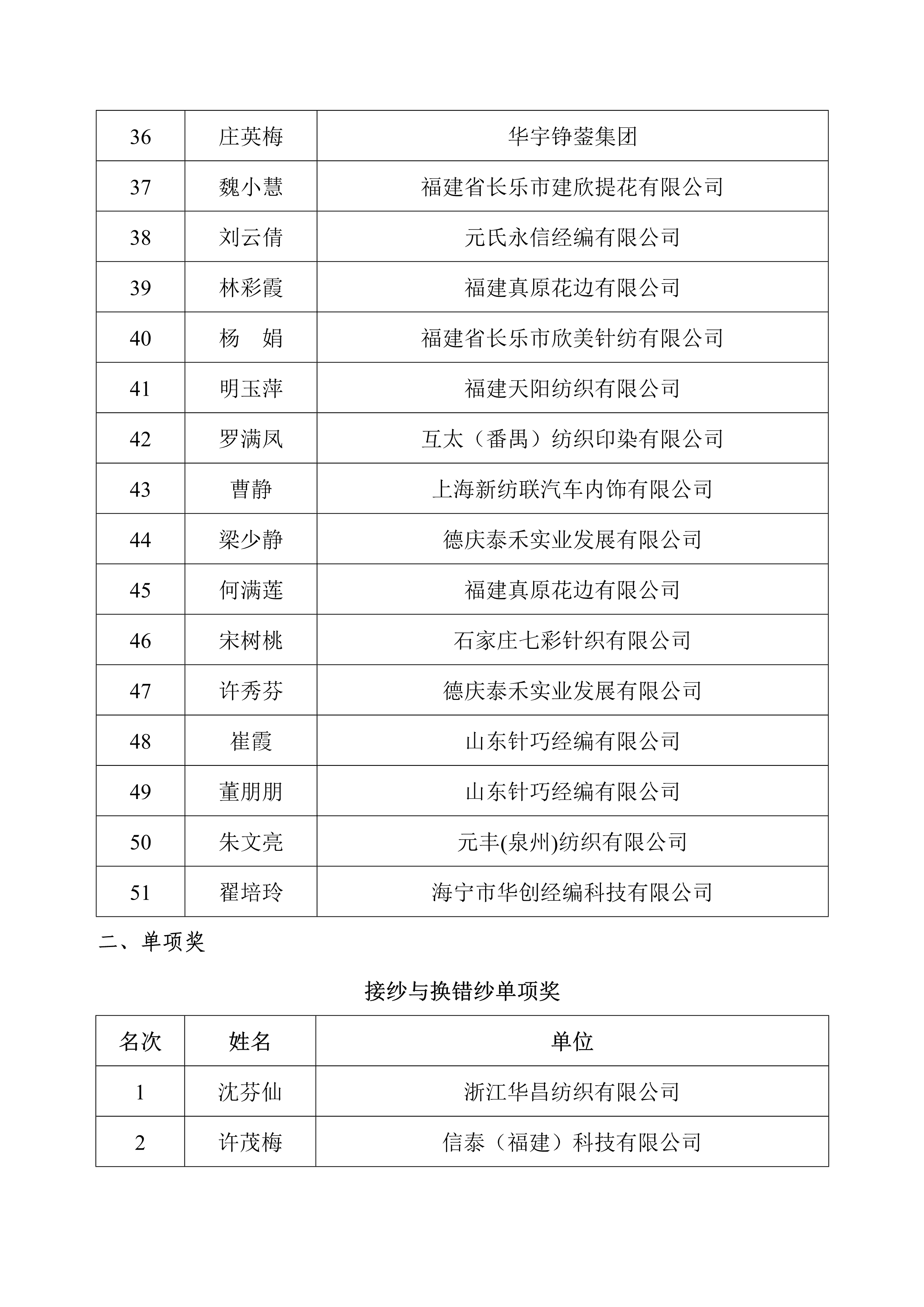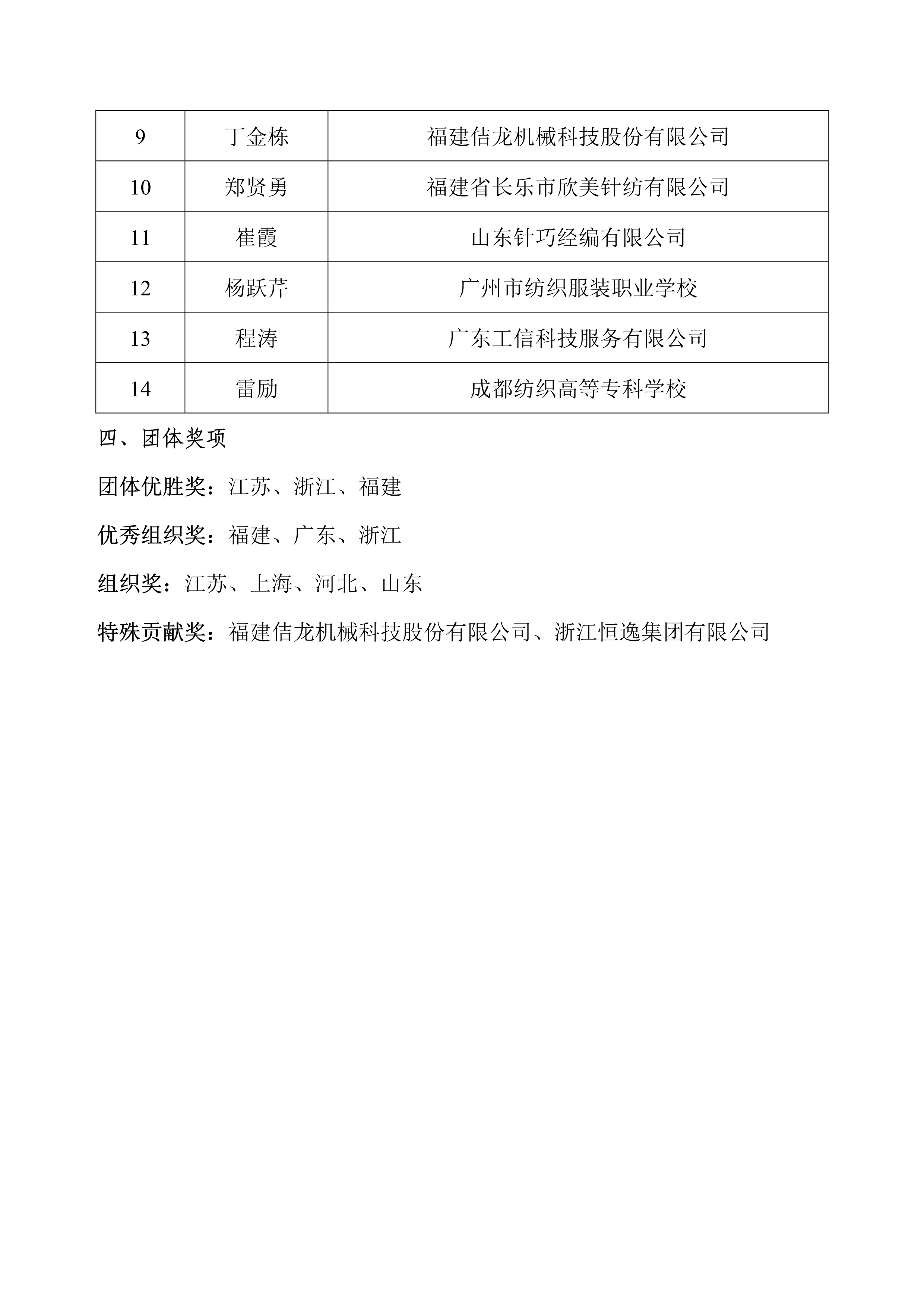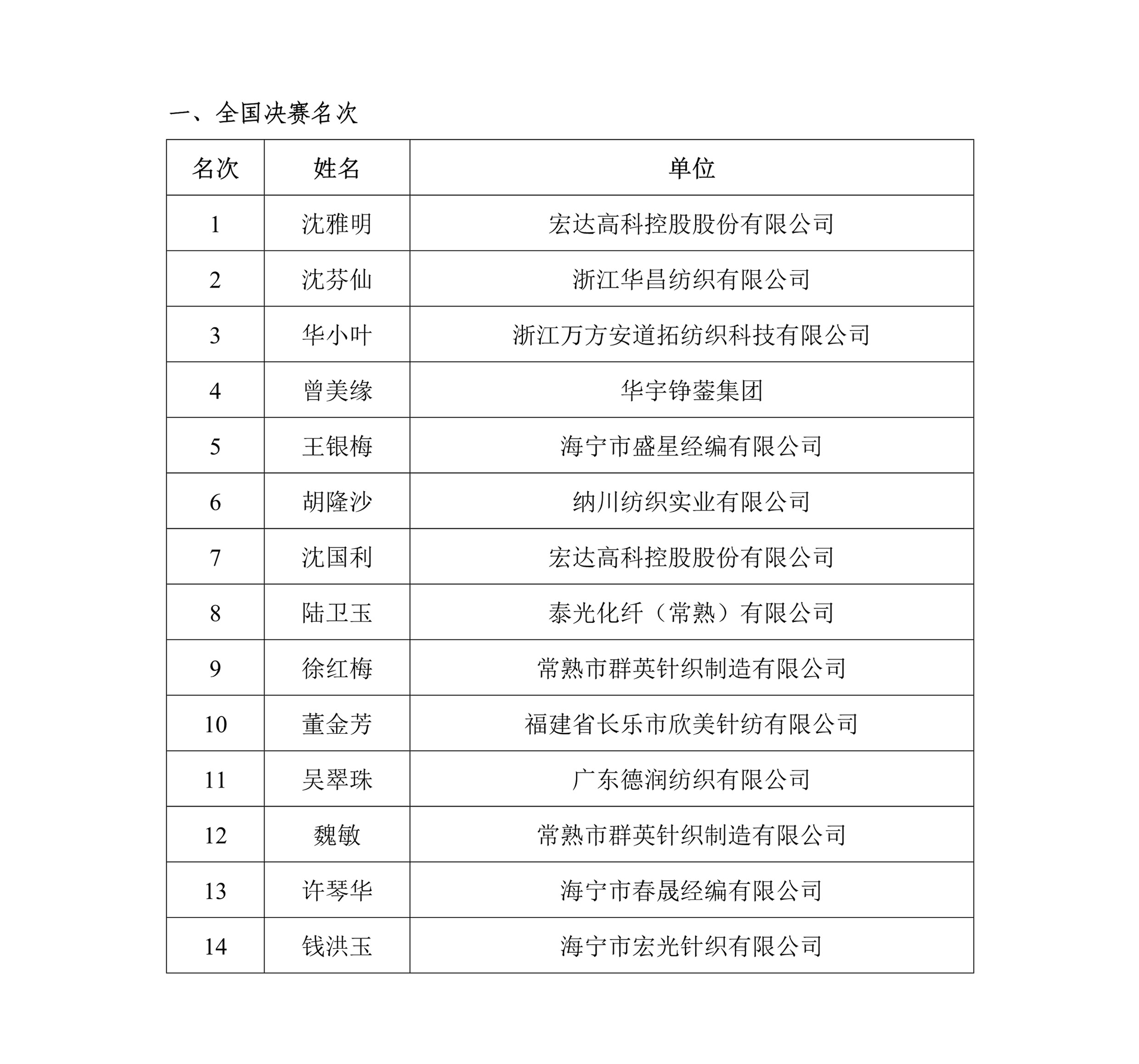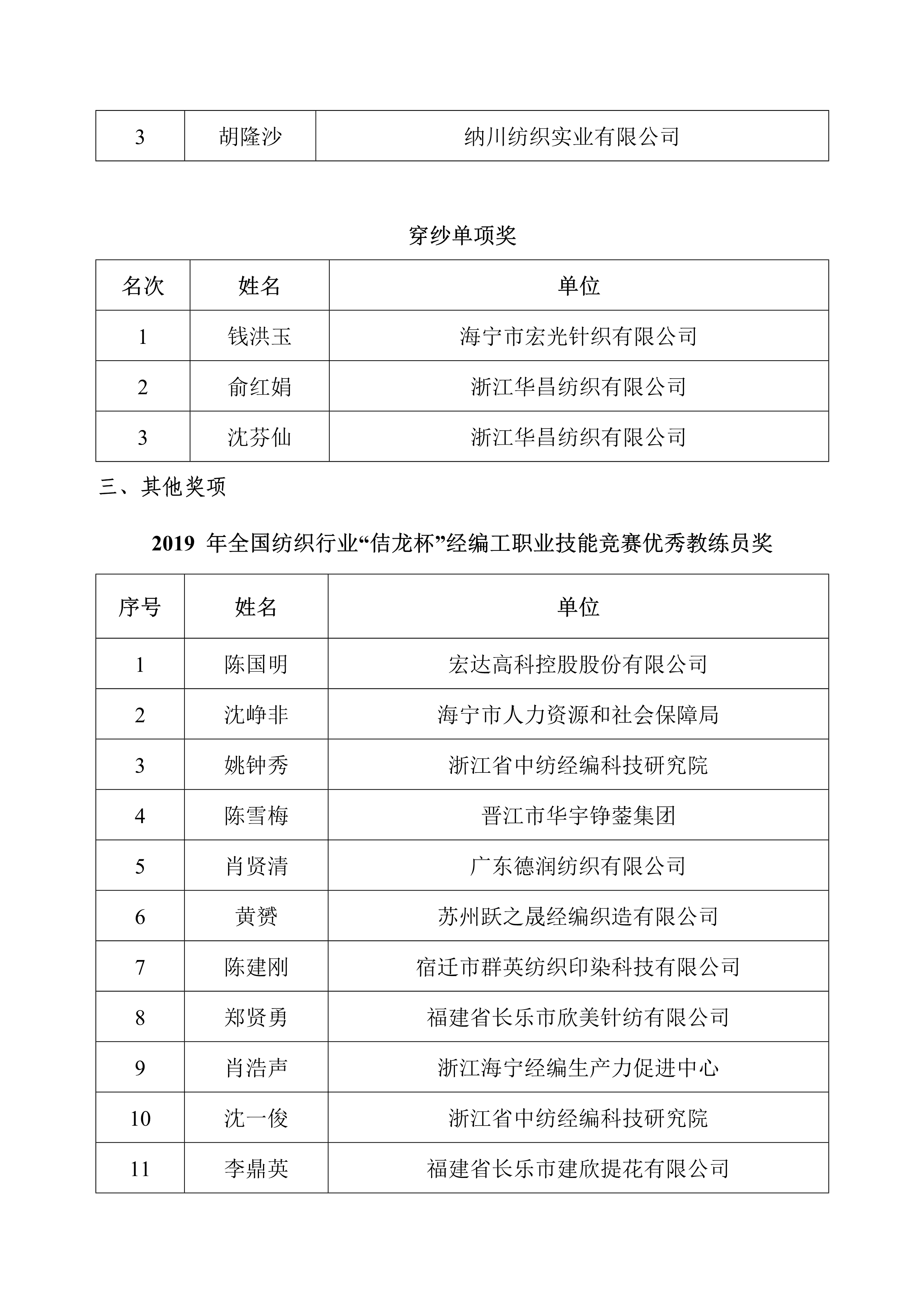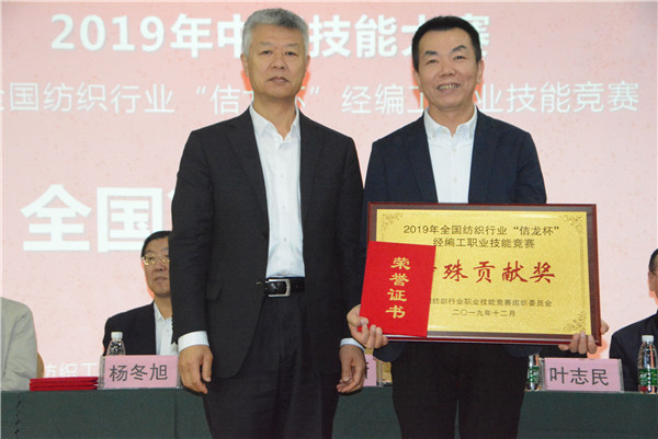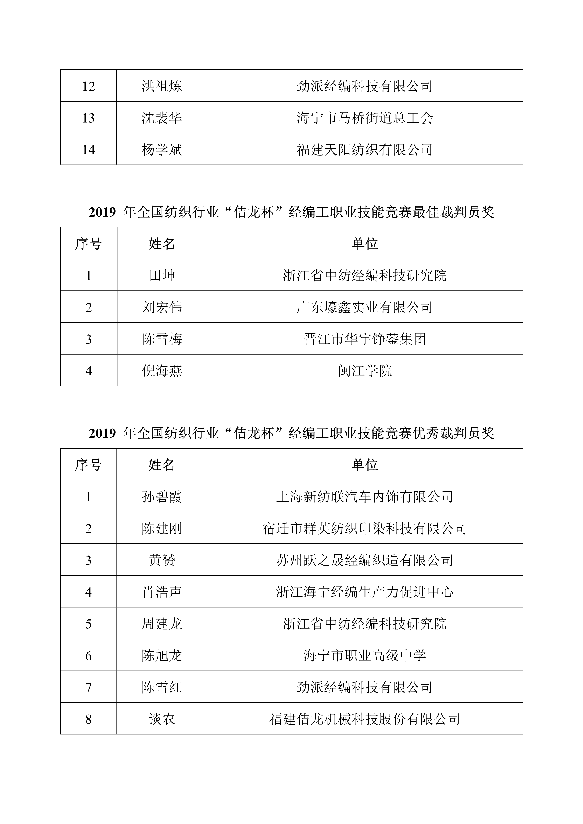 本次全國決賽根據(jù)《紡織行業(yè)職業(yè)技能競(jìng)賽管理暫行辦法》的有關(guān)規(guī)定,中國紡織工業(yè)聯(lián)合會(huì)決定授予獲得2019年中國技能大賽——全國紡織行業(yè)“佶龍杯”經(jīng)編工職業(yè)技能競(jìng)賽全國決賽第一至三名同志“全國技術(shù)能手”榮譽(yù)稱號(hào);第一至六名的六位同志“全國紡織行業(yè)技術(shù)能手”榮譽(yù)稱號(hào),并頒發(fā)全國紡織行業(yè)技術(shù)能手獎(jiǎng)金、獎(jiǎng)杯和榮譽(yù)證書,第一名頒發(fā)獎(jiǎng)金10000元,第二至六名頒發(fā)獎(jiǎng)金6000元,獎(jiǎng)金由紡織之光科技教育基金會(huì)提供支持;全國決賽第七至第十八名的同志“全國針織行業(yè)技術(shù)能手”榮譽(yù)稱號(hào),并頒發(fā)全國針織行業(yè)技術(shù)能手獎(jiǎng)杯、榮譽(yù)證書;全國決賽獲得第十九到第三十名的同志“全國針織行業(yè)經(jīng)編操作能手”榮譽(yù)稱號(hào),并頒發(fā)榮譽(yù)證書;全國決賽獲得第三十到第五十一名的同志“全國紡織行業(yè)“佶龍杯”經(jīng)編工職業(yè)技能競(jìng)賽優(yōu)秀操作能手”榮譽(yù)稱號(hào),并頒榮譽(yù)證書。