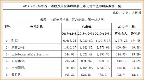 又到一年盤點時。伴隨著2019的結(jié)束,回顧這一年257家滬深兩市、港股和美股中的紡織服裝企業(yè)這一年的表現(xiàn)我們注意到,安踏體育、申洲國際的市值已經(jīng)躍居前五,李寧也則超越了斯凱奇,距前十僅一步之遙。