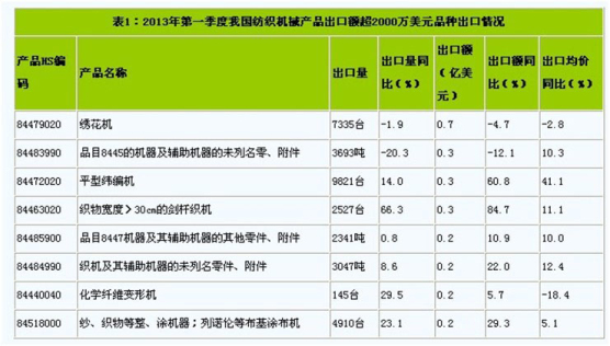 今年第一季度,我國紡織機械產(chǎn)品共出口5.4億美元,同比增長8.2%。其中,對印度出口9717萬美元,下降4.3%,對越南出口6272萬美元,迅猛增長2倍。對以上兩市場出口額合計占同期紡織機械類產(chǎn)品出口總額的29.5%。出口額超2000萬美元的主要品種出口情況如表1所示: