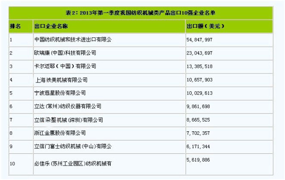 從出口企業(yè)情況來看,我國紡織機械類產(chǎn)品出口集中度相對集中,出口額排名前10位企業(yè)出口額合計占同期我國紡織機械類產(chǎn)品出口總額的27.7%。今年第一季度出口10強企業(yè)名單如表2:
