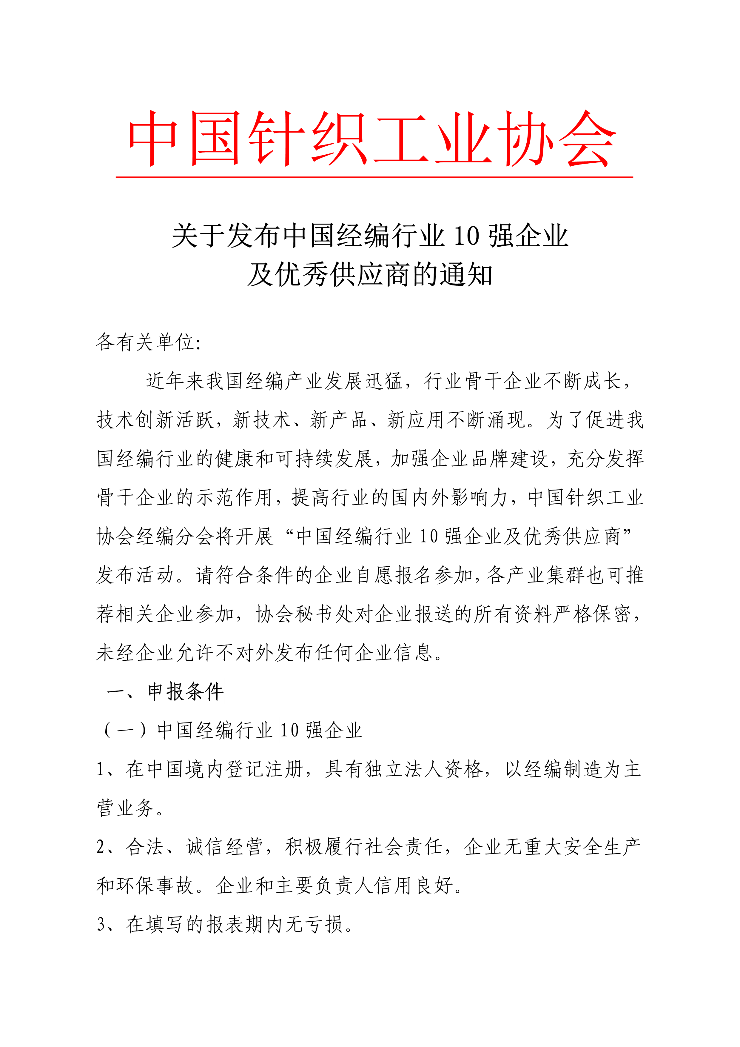 關(guān)于發(fā)布中國經(jīng)編行業(yè)10強(qiáng)企業(yè)及優(yōu)秀供應(yīng)商的通知