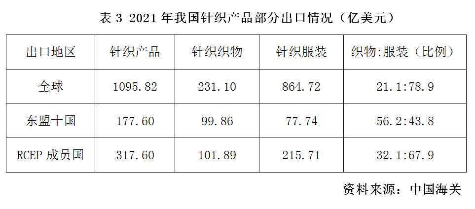 由于RCEP成員國還包括了日本、韓國、澳大利亞和新西蘭,2021年僅對日韓的針織服裝出口總額就達(dá)到了107.44億美元。所以我國對RCEP成員國出口針織織物和針織服裝的比重大致與全球情況保持一致。